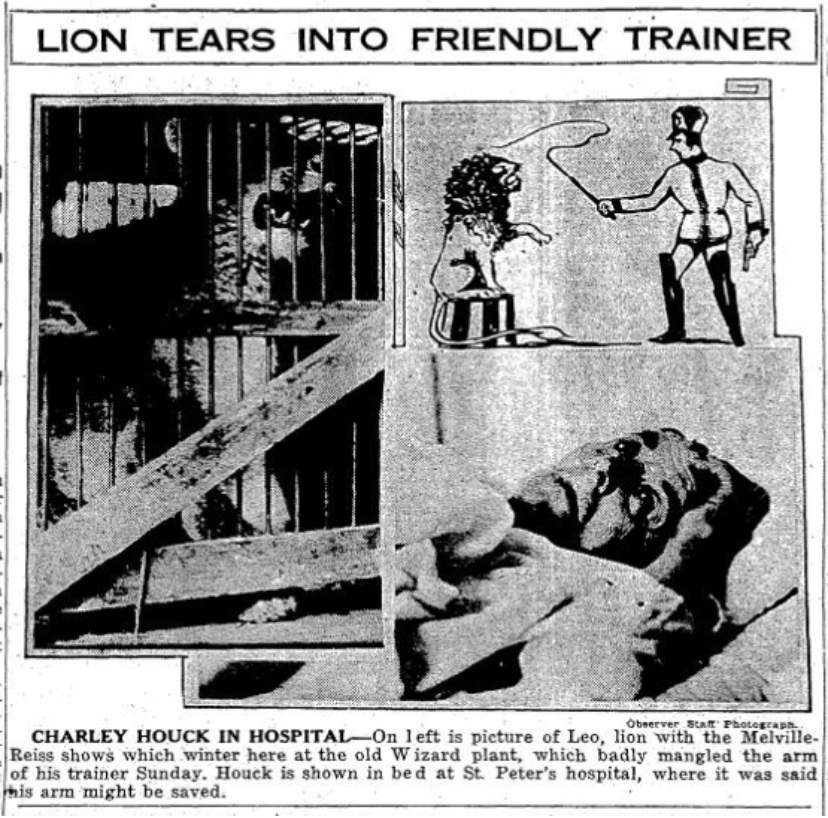 Houck was a single 65 year old man and head Animal Trainer for the circus. One night after feeding Leo Charlie went to give him a pat on the head. Leo clawed at Charlie’s arm pulling him closer to the cage. Houck did pull free, but was dead from infection within the week.